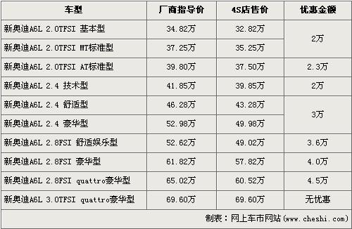 據(jù)4S店銷售人員介紹,目前奧迪A6L全系可以最高優(yōu)惠4.5萬元。奧迪A6L全系分為2.0TFSI,2.4L,2.8FSI,3.0TFSI四種共10個車型,最低配的2.0TFSI基本型經(jīng)2萬元優(yōu)惠后售價從34.82萬元下降到了32.82萬元,而2.8TSI quattro豪華版經(jīng)全系最高的4.5萬元優(yōu)惠后售價也降到了60.52萬元。全系最高配的3.0TFSI quattro豪華版目前店內(nèi)沒有現(xiàn)車,欲購買的消費(fèi)者需要交1萬元訂金,約等3個月后方可提車。