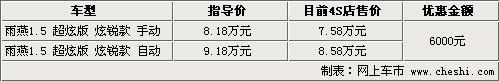 長安鈴木雨燕以其圓潤優(yōu)雅的外形,逐漸受到了消費者的青睞,新雨燕自從上市以來,其銷售情況一直比較穩(wěn)定。由于排放問題的影響,因此1.3L雨燕在北京市場上已經(jīng)不再銷售。目前在北京市場上,購買長安鈴木雨燕1.5L超炫版炫銳款可以得到6000元的優(yōu)惠。具體車型詳見下表: