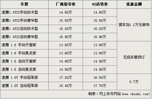 據(jù)一汽大眾4S店銷售人員介紹,店內(nèi)有速騰最新上市的1.4TSI車型現(xiàn)車,并且近期購買1.4TSI的消費者需加裝價值1.2萬元的裝飾才可提車。1.6L車型全部沒有現(xiàn)車,欲購買者需交訂金1萬元,約等2個月才可提車。近期購買1.8T車型的消費者可以得到7000元的現(xiàn)金優(yōu)惠。