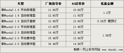 馬自達(dá)3自4月份1.6L的自動(dòng)天窗版車型上市以來(lái),一直受到消費(fèi)者關(guān)注。運(yùn)動(dòng)與操控完美結(jié)合讓馬自達(dá)3擁有較好的口碑。根據(jù)網(wǎng)上車市價(jià)格監(jiān)測(cè)系統(tǒng)顯示,馬自達(dá)3現(xiàn)最高優(yōu)惠1.58萬(wàn)元。具體行情如下: