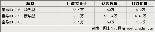 據(jù)4S店銷售人員介紹:目前寶馬X3全系3款車型全部有優(yōu)惠,最高優(yōu)惠7.5萬(wàn)元。目前X3 2.5i豪華型與3.0i有現(xiàn)車,2.5i豪華型現(xiàn)車顏色有黑色、金色、銀色、灰色、白色,現(xiàn)車比較多顏色較齊全;3.0i車型僅有銀色現(xiàn)車。X3領(lǐng)先型預(yù)定需等到今年底活明年初,如果不著急購(gòu)買的消費(fèi)者可以等待。目前購(gòu)買X3任何一款車型,均可獲得原車導(dǎo)航系統(tǒng)。