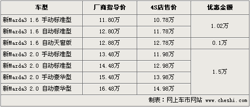 馬自達3自4月份1.6L的自動天窗版車型上市以來,一直受到消費者關注。運動與操控完美結合讓馬自達3擁有較好的口碑。根據(jù)網(wǎng)上車市價格監(jiān)測系統(tǒng)顯示,馬自達3現(xiàn)最高優(yōu)惠1.5萬元,1.6L有少量現(xiàn)車供應。具體行情如下:
