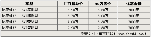 作為比亞迪汽車旗下的重點(diǎn)產(chǎn)品,比亞迪F3在今年又推出了智能白金版,新款車型增加了無鑰匙系統(tǒng)、智能娛樂通訊系統(tǒng)等高端配置。網(wǎng)上車市網(wǎng)站了解到,比亞迪F3智能白金版全系車型年末正在各家經(jīng)銷商店內(nèi)促銷,目前全系可給出7000元的優(yōu)惠。詳情如下:
