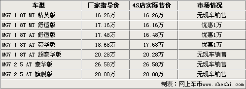據(jù)名爵4S店銷售人員介紹,名爵MG7只有1.8T車型是店內(nèi)較為齊全的車型,2.5排量車型均需要提前預(yù)定,F(xiàn)在購(gòu)買名爵MG7 1.8T車型在店內(nèi)可直接優(yōu)惠1萬(wàn)元,比前一段時(shí)間的優(yōu)惠幅度有所提高。現(xiàn)在購(gòu)車除了可以享受到現(xiàn)金優(yōu)惠外,還可以享受到商家贈(zèng)送的價(jià)值7000元的裝飾禮包。北京地區(qū)各4S店由于訂單不同,各店銷售的現(xiàn)車顏色有所不同,消費(fèi)者在購(gòu)買前可以多去幾家4S店。