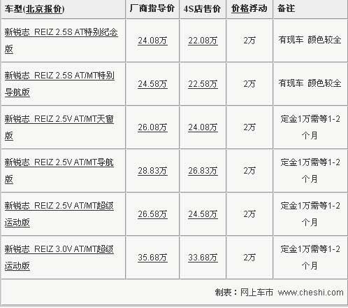 據(jù)北京一汽豐田4S店銷售人員介紹,目前銳志全系優(yōu)惠2萬(wàn)元,銳志 REIZ 2.5S AT特別紀(jì)念和2.5S AT/MT特別導(dǎo)航版有現(xiàn)車供應(yīng),且顏色較全,其余高配車型均需要預(yù)定。銷售人員還表示:現(xiàn)車的顏色有銀、白、黑、紅可供選擇,有現(xiàn)車的這兩款車型是豐田銳志賣的最火的也是性價(jià)比最高的兩款車型。消費(fèi)者交定金1萬(wàn)等待1-2個(gè)月便可提車。北京地區(qū)各4S店由于訂單不同,各店銷售的現(xiàn)車顏色有所不同。