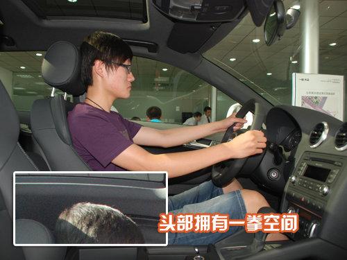 A3算是奧迪家族里面身材最為迷你的一位成員了,三圍參數(shù):4292mm*1765mm*1423mm,軸距為2578mm,絕對的緊湊級身材。視覺從車外直觀看過去,相對低矮的車身有點擔心空間的問題,測試者178CM。