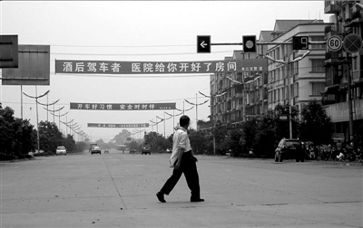 進(jìn)入夾江城區(qū),主要街道上隨處可見禁止酒后駕車的宣傳橫幅。其中,縣城瓷都大道與迎春南路交會處的兩條標(biāo)語尤為醒目,上面分別寫著“酒后駕車者醫(yī)院給你開好了房間”“酗酒開車是駛向死亡與墳?zāi)沟倪x擇”等警示內(nèi)容。