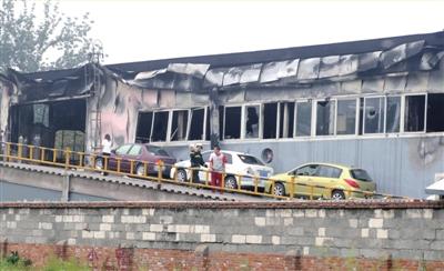 4S店的維修車間被燒毀,消防員正在現(xiàn)場(chǎng)處理。王苡萱攝