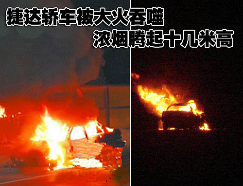 自燃的捷達轎車被大火全部吞噬,濃煙騰起十幾米高,油箱內(nèi)泄漏的汽油在地面上也燃燒起來。車主稱,車輛行駛途中大燈突然熄滅,他將車?康铰愤叢蕚溆密嚿系臏缁鹌鬟M行撲救,但滅火器已經(jīng)失效無法使用。