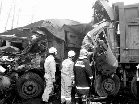 10時(shí)30分許,禹州市花石鄉(xiāng)境內(nèi)倔山村附近,兩輛滿載煤炭的大貨車相撞,4名人員受傷被困。禹州消防大隊(duì)接警后迅速趕往現(xiàn)場。由于霧大,車速受到限制,消防官兵在途中與報(bào)警人保持通話,電話指揮在場人員自救,在消防官兵趕到前,有3名被困人員成功獲救。