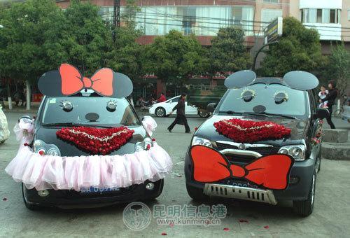 “還是那次澄江旅游給了我們靈感。”余先生興奮地說,戀愛時,他們曾自駕車到澄江旅游,那時,妻子看著兩人的車突然對余先生說,“你看我的車像不像個男孩,而你的車小小的,像個女孩!币徽Z既出,兩人甜蜜地笑了。“想到那時候老婆說的這句話,我就決定主婚車用我們兩人的車,分別裝扮成男女米老鼠的樣子!