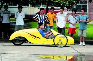 日前,廣西工學(xué)院汽車工程系4名學(xué)生設(shè)計制成一輛新型環(huán)保車,每百公里耗油僅1.2升。該車最快時速能達到65公里。這輛環(huán)保車除了發(fā)動機外,全為手工制作,車身用玻璃鋼材料制成,零件是學(xué)生自己動手焊接而成。該車前輪為兩個自行車輪胎,后輪為摩托車輪胎。整車重量為37.5公斤,造價不足5000元。