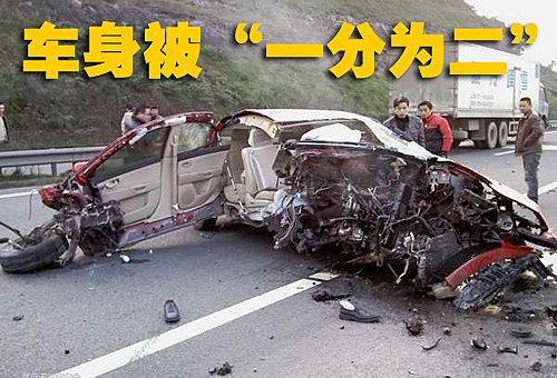 車頭受損非常嚴(yán)重,已經(jīng)面目全非,在左側(cè)基本已經(jīng)無法看出這是一輛什么品牌的汽車。副駕駛席的乘客被甩出車外,鞋子留在了路上。因為撞擊點在副駕駛員一側(cè),駕駛員一側(cè)留有安全的空間,所以駕駛員并無生命危險。