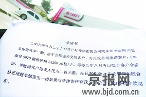 上午10時(shí)許,記者來到了位于豐臺區(qū)花鄉(xiāng)羊坊930號的金博藍(lán)汽車銷售服務(wù)公司,新車停車場里和展示廳內(nèi)只有4輛新車待售,偶爾還有人在看車試車。買了車卻拿不到合格證的車主陸續(xù)來到4S店,他們手中都拿著一份“承諾書”,其中承諾8月5日交付合格證,并賠償一定金額,如果違約則全款退車。
