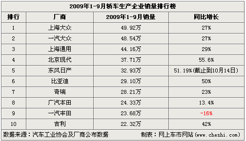 近日,來自汽車工業(yè)協(xié)會(huì)的數(shù)據(jù)顯示,今年1-9月,乘用車?yán)塾?jì)銷量超過720萬輛,比去年全年凈增48.59萬輛,同比增長(zhǎng)超過40%,創(chuàng)歷年最高。轎車生產(chǎn)企業(yè)銷量排行前十位的廠商,都獲得了大幅增長(zhǎng)當(dāng)然不包括一汽豐田,它比較意外的出現(xiàn)了負(fù)增長(zhǎng),同比下滑了16%,是銷量排行前十位的廠商中唯一下滑的車廠(詳見下表)。