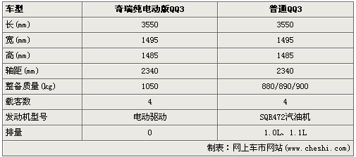從基本參數(shù)來看,純電動版QQ3與普通版QQ3相比,車身尺寸沒有變化,不過在車重上增加了不少,這可以看出電動模塊還是比較重的,當然比較特別的電動QQ3絕對零排放,不過對于電動模塊的參數(shù)暫時還沒有,有待進一步的消息發(fā)布。