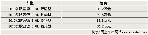 2010款三菱歐藍德共推出四款車型,分為2.4L和3.0L兩種排量,其中2.4L舒適型為兩驅(qū)版,售價26.2萬元。其他三款車型均為四驅(qū)版,售價29.8萬元、33.8萬元和36.2萬元。據(jù)悉,目前2010款歐藍德只有少數(shù)展車到店,大部分車型現(xiàn)在都只能預(yù)訂,大概需要七個工作日即可提車。