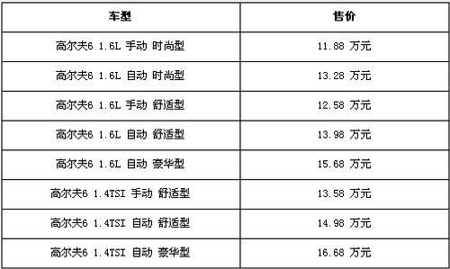 一汽大眾第六代高爾夫大眾第六代高爾夫19日在長春一汽大眾二廠總裝車間內(nèi)上市。此次上市的車型包括三款1.6L車型、二款1.4T車型,售價(jià)區(qū)間為:11.88-16.68萬元。具體價(jià)格表如下: