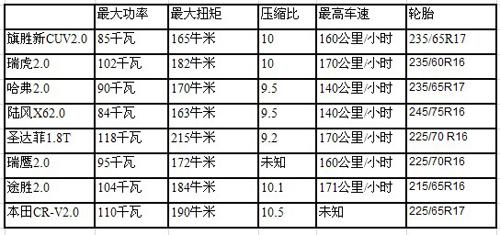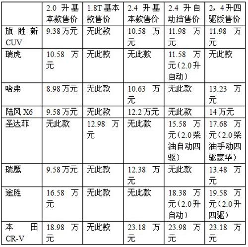 我們從廠家了解到,新旗勝已經(jīng)全面上市,動力分為2.0升和2.4升兩個系列,分為兩驅(qū)和四驅(qū)共6個車型。外形看,這是一款頗為漂亮的車子,外形、做工和配置,與其售價很是不符。為了讓大家對其有所了解,這里把新旗勝和同級的幾款自主品牌SUV以及小一個級的SUV(比如瑞虎)做一番簡單對比。為了參考的更全面,還把包括本田CR-V在內(nèi)的幾款合資車同時排列,盡管它們所面對的,并非同一個市場,特別是像本田這樣的車型,與自主品牌相比,品牌價值差異較大,不能做直接對比,只能是個參考。
