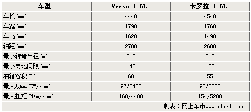 豐田Verso與卡羅拉雖然采用了同一技術(shù)平臺,但是由于這兩款車的類型不同,因此在車身尺寸方面也存在著較大的差異。豐田Verso雖然在車長方面遜于卡羅拉,但是在車寬、車高及軸距方面,這款MPV車型還是占據(jù)著明顯的優(yōu)勢。另外,這兩款車雖然均采用1.6L發(fā)動機,但是由于調(diào)校的不同,豐田Verso在動力上要優(yōu)于卡羅拉。
