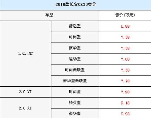 今日,長(zhǎng)安汽車旗下兩廂新車CX30正式上市,此次上市的共兩個(gè)排量9款車型,其中包括低碳弱混合動(dòng)力車型,售價(jià)區(qū)間為6.88-9.98萬(wàn)元。具體的車型售價(jià)請(qǐng)見(jiàn)下表:
