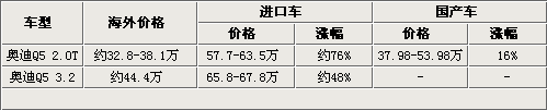 從以上表格中我們可以看到,奧迪Q5在海外的售價(jià)約合人民幣32.8-44.4萬元,旗下的2.0TFSI和3.2FSI車型以進(jìn)口的形式進(jìn)入國內(nèi)后,價(jià)格分別有了76%和48%的漲幅。但隨后奧迪Q5選擇了國產(chǎn),以此來降低奧迪Q5的成本和價(jià)格。我們看到,國產(chǎn)后的奧迪Q5價(jià)格漲幅只有16%,比進(jìn)口車型下降了很多。