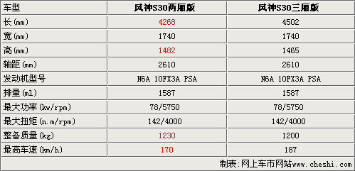 風(fēng)神S30兩廂版在尾部的車身結(jié)構(gòu)上有明顯變化,所以整車的參數(shù)也會(huì)隨之改變。通過與三廂車型的參數(shù)對(duì)比發(fā)現(xiàn),風(fēng)神S30兩廂版的車身尺寸有了明顯變化,其中長(zhǎng)度縮短了234毫米,高度則增加了17毫米。雖然外形尺寸有明顯變化,但風(fēng)神S30兩廂版的軸距并無改變,保障了后排的空間優(yōu)勢(shì)。風(fēng)神S30兩廂版依然采用PSA 1.6L發(fā)動(dòng)機(jī),但整備質(zhì)量增加了30公斤,多少會(huì)影響整車的動(dòng)力性能,最高車速只能達(dá)到170公里每小時(shí)。
