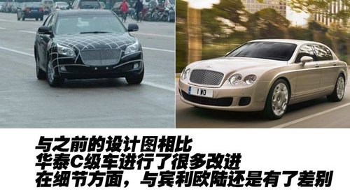 華泰B級(jí)車的車身尺寸足以媲美賓利歐陸飛馳,而且整車的側(cè)面腰線也非常流暢,但與賓利前后線條下墜的樣式還是有不同之處。而且尾部的造型雖然摻雜了一些模仿的元素,但尾燈、霧燈包括輪轂等設(shè)計(jì)都全然不同。