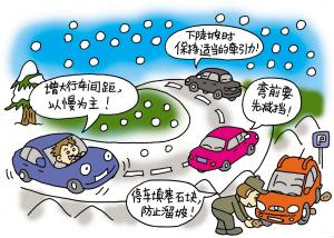 對于雪地的駕駛技巧,交警部門提醒車主,關(guān)鍵是以“慢”為主,并與前車保持足夠的剎車距離。然而,路況的復(fù)雜,讓很多駕駛員在發(fā)生側(cè)滑時(shí)感到緊張!叭绻囕v打滑,方向盤要順著打滑方向輕輕地轉(zhuǎn),待車輪回正后,再輕輕地踩剎車!薄瓣P(guān)鍵是要慢,平穩(wěn)地減速及輕踩剎車,絕對不要在冰雪濕滑的路面上猛起步,或緊急剎車。”杭城資深出租車司機(jī)師傅們紛紛提供雨雪天氣駕駛竅門。