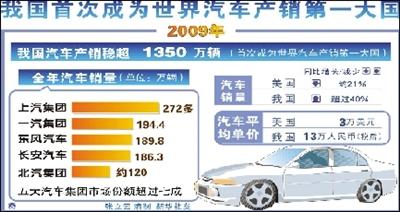 中國汽車技術(shù)研究中心首席專家黃永和10日對記者說,2009年中國汽車產(chǎn)銷超過1350萬輛,首次成為世界汽車產(chǎn)銷第一大國。他預計2010年中國汽車產(chǎn)銷會超過1500萬輛,跨國汽車公司將從中繼續(xù)受益。據(jù)新華社電