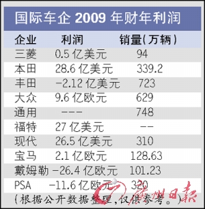 就拿現(xiàn)在全球風(fēng)頭“最勁”的大眾汽車來看,2009財(cái)年的營(yíng)業(yè)額超過1000億歐元,但利潤(rùn)只有區(qū)區(qū)9.6億歐元,利潤(rùn)率還不到1%,如果按其629萬(wàn)輛的銷量來計(jì)算,每輛車的平均利潤(rùn)僅有100多歐元,大眾去年全年的盈利恐怕還沒有其在中國(guó)的兩個(gè)合資企業(yè)一汽大眾、上海大眾的合計(jì)多。曾經(jīng)是全球第一賺錢車企的豐田汽車受銷量下滑和“召回門”的影響,2009財(cái)年預(yù)計(jì)出現(xiàn)2億多美元的虧損;即使是國(guó)人看來利潤(rùn)豐厚的豪華車制造商戴姆勒-奔馳和寶馬,日子也不是那么滋潤(rùn)。寶馬集團(tuán)去年在全球售出了近130萬(wàn)輛汽車,但只有區(qū)區(qū)2.1億歐元的純利潤(rùn),而戴姆勒-奔馳更是出現(xiàn)了20多億歐元的虧損。