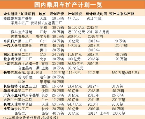 如此龐大的產(chǎn)能擴(kuò)充計(jì)劃讓相關(guān)各方憂心忡忡。今年年初,工信部向國內(nèi)車企下發(fā)了《關(guān)于調(diào)查汽車生產(chǎn)企業(yè)投資項(xiàng)目有關(guān)情況的通知》,通知要求車企上報(bào)現(xiàn)有產(chǎn)能情況和2010年~2015年產(chǎn)能規(guī)劃和投資情況。市場(chǎng)的火爆讓“產(chǎn)能過剩”的憂患呼聲逐漸熄滅,對(duì)部分廠家而言,最核心的任務(wù)仍然是增加產(chǎn)能。