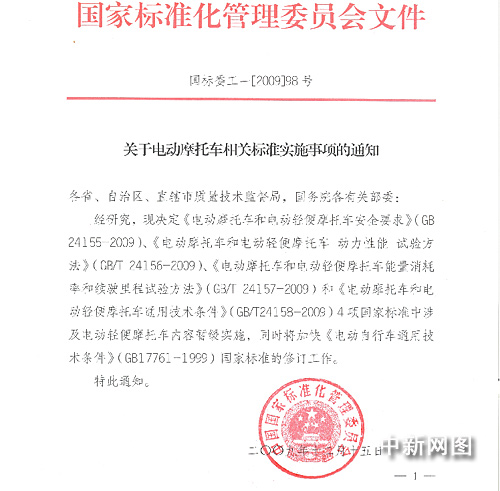 中新網(wǎng)12月16日電 今天,國(guó)家標(biāo)準(zhǔn)化管理委員會(huì)在其官方網(wǎng)站發(fā)出《關(guān)于電動(dòng)摩托車相關(guān)標(biāo)準(zhǔn)實(shí)施事項(xiàng)的通知》。通知要求,《電動(dòng)摩托車和電動(dòng)輕便摩托車通用技術(shù)條件》等4項(xiàng)國(guó)家標(biāo)準(zhǔn)中,涉及電動(dòng)輕便摩托車的內(nèi)容暫緩實(shí)施。