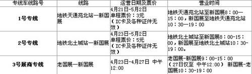 本次北京車展開通了兩條車展專用公交車線路和一條新-老國展展商專線。線路運(yùn)營時(shí)間及票價(jià)如下: