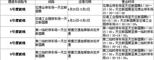 喜歡自駕車的朋友們,新國展在花博會設(shè)立了專門的停車場,大家可以把車停到這里然后乘坐車展的擺渡車直接前往展館。擺渡車的路線和運營時間如下表:
