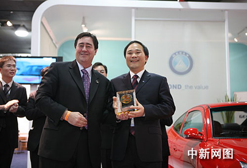 中新網(wǎng)1月16日電 當(dāng)?shù)貢r(shí)間1月14日下午,2008底特律車展組委會主席卡爾•加里亞拉來到吉利展臺,將本次展會一份非常特殊的大獎授予吉利集團(tuán)董事長李書福,表彰他多年來領(lǐng)導(dǎo)吉利汽車不斷進(jìn)取、不斷進(jìn)步所取得的非凡成就。