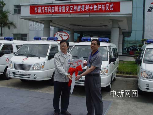 5月14日,在福建省紅十字會(huì)的見(jiàn)證和協(xié)助下,由東南汽車(chē)捐贈(zèng)的十輛價(jià)值百萬(wàn)元的救災(zāi)急需東南得利卡救護(hù)車(chē)啟運(yùn)四川地震災(zāi)區(qū),為災(zāi)區(qū)民眾奉獻(xiàn)愛(ài)心,攜手人道,協(xié)助救助災(zāi)難中的同胞和親人。同日,東南汽車(chē)號(hào)召全體員工向?yàn)?zāi)區(qū)人民獻(xiàn)愛(ài)心,得到公司兩千多名員工的積極響應(yīng)。