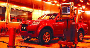 一輛風(fēng)駿皮卡安靜地停在一間大房子內(nèi),天花板上的幾臺(tái)高功率射燈讓它看上去光彩照人。但過不了多久,這些大燈就會(huì)讓風(fēng)駿暴露在強(qiáng)烈的“熱帶陽光”之下,接下來,這輛倒霉的實(shí)驗(yàn)車可能還要在模擬行駛的狀態(tài)下接受從零上40度到零下60度環(huán)境溫度變化的考驗(yàn)。