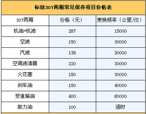 5.保養(yǎng)費: 我們向標致4S店售后服務(wù)人員咨詢過,他們說307一大優(yōu)勢是保養(yǎng)周期比較長,1.5萬公里才需要保養(yǎng)一次,是同級車型中保養(yǎng)花費最低的。通常新車首保在7500公里時進行,以后每1.5公里保養(yǎng)一次。第二次1.5萬公里時的常規(guī)保養(yǎng)(更換機油機濾)需花費287元;3萬公里保養(yǎng)(更換機油機濾+空濾+空調(diào)濾芯+汽濾+火花塞)為795元;4.5萬公里保養(yǎng)(更換機油機濾)花費287元;6萬公里保養(yǎng)(更換機油機濾+空濾+空調(diào)濾芯+汽濾+火花塞)為795元。