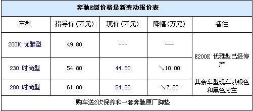 近日,編者從上海匯之星奔馳汽車服務(wù)有限公司獲悉。奔馳E級(jí)在滬最有優(yōu)惠達(dá)到了10萬(wàn)元,目前E230 時(shí)尚型最低售價(jià)不到45萬(wàn)元,E280 時(shí)尚型的售價(jià)也僅有54.8萬(wàn)元,而E200K 優(yōu)雅型沒(méi)有現(xiàn)車,且確定已經(jīng)停產(chǎn)不再接受預(yù)定。具體詳情請(qǐng)見下表: