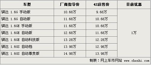 騏達一直是東風日產(chǎn)系列車型中最為暢銷的車型之一,同時也是在同級別車型中表現(xiàn)最為突出的車型之一,自上市以來受到眾多消費者的喜愛。根據(jù)網(wǎng)上車市價格監(jiān)測系統(tǒng)顯示,目前這款車現(xiàn)車比較緊張,購車的消費者可享受1萬元的現(xiàn)金優(yōu)惠,具體行情如下: