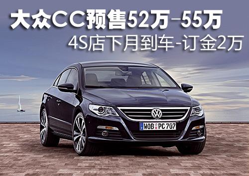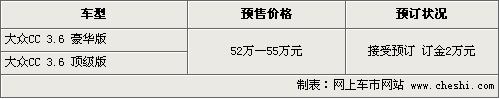 大眾CC自去年廣州車展亮相后一直受到消費(fèi)者廣泛關(guān)注,此前有關(guān)這款車的詳細(xì)參數(shù)和配置已經(jīng)曝光。大眾CC將搭載3.6FSI燃油直噴引擎和6速DSG雙離合變速箱,將分豪華版和頂級版兩款。根據(jù)網(wǎng)上車市價格監(jiān)測系統(tǒng)顯示,目前這款車有望在下月到店,4S店開始接受消費(fèi)者預(yù)訂,具體行情如下:
