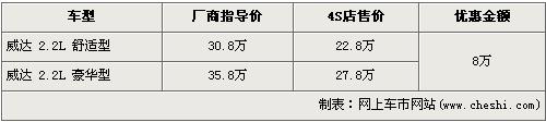 據(jù)經(jīng)銷商銷售人員介紹,威達(dá)全系現(xiàn)金優(yōu)惠8萬元。目前歐寶威達(dá)僅2.2L舒適版和2.2L豪華版兩款車型在銷售,經(jīng)優(yōu)惠8萬元后,2.2L豪華型售價(jià)降到了27.8萬元,2.2L舒適型首次跌破23萬,售價(jià)僅為22.8萬元,F(xiàn)車的數(shù)量一般顏色也不是很齊全,消費(fèi)者挑選的余地很受限制。