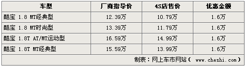 酷寶系列車(chē)型,不僅外形時(shí)尚,動(dòng)力也相當(dāng)充沛,不僅可與進(jìn)口跑車(chē)如蓮花競(jìng)速相媲美,也帶動(dòng)了自主跑車(chē)市場(chǎng)的競(jìng)爭(zhēng)。近期網(wǎng)上車(chē)市網(wǎng)站了解到,隨著市場(chǎng)競(jìng)爭(zhēng)的加劇,現(xiàn)在各家4S店均可給出全系16000元的現(xiàn)金優(yōu)惠,令此車(chē)型再次引起關(guān)注。具體詳情如下: