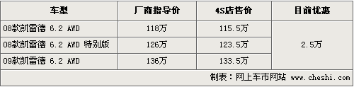 凱雷德是凱迪拉克家族一款大尺寸的SUV產(chǎn)品,結(jié)合6.2的大排量,從內(nèi)而外都給人粗曠和厚實的感覺。其搭載的全新的6前速手自一體自動變速箱非常適用于低轉(zhuǎn)速高速巡航,也極大提高了瞬間的加速性能。根據(jù)網(wǎng)上車市價格監(jiān)測系統(tǒng)顯示,目前凱雷德優(yōu)惠2.5萬元,具體車型以及價格如下: