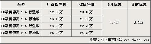 據(jù)北京地區(qū)廣州本田4S點(diǎn)銷售人員表示,目前銷售的08款?yuàn)W德賽降幅又出現(xiàn)了新的優(yōu)惠幅度。3月份左右,奧德賽全系優(yōu)惠到了1.4萬元,而目前增加到了2.2萬元,直接增加8000元,最低價(jià)格僅售20.18萬元。現(xiàn)在購車除了可以得到現(xiàn)金優(yōu)惠外,還可以得到商家贈(zèng)送的原廠汽車裝飾。在現(xiàn)售的四款?yuàn)W德賽車型中,普通版座椅為絨布材質(zhì),其他三款均為真皮材質(zhì),現(xiàn)車多以黑色和銀色為主。