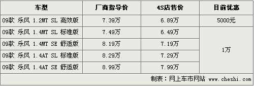 據(jù)4S店銷售人員介紹,目前銷售的樂風為09款車型,主要包括1.2和1.4兩個排量,1.6排量車型廠家尚未排產(chǎn)。目前購買樂風1.2排量可以優(yōu)惠5000元現(xiàn)金,最低僅售6.89萬元。1.4排量全系列優(yōu)惠現(xiàn)金1萬元,頂配自動檔車型優(yōu)惠后售價不足8萬元。在外觀顏色上,目前有藍色,銀色,紅色可供消費者選擇,內(nèi)飾均為米色。