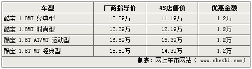 據(jù)4S店銷售人員介紹,此次酷寶系列車型涉及系列內(nèi)各款車型,1.8L手動時尚型及1.8T自動版運(yùn)動型車型的現(xiàn)車各店最高可給出12000元的現(xiàn)金優(yōu)惠。而1.8T系列車型部分顏色需要訂購,優(yōu)惠幅度同樣可達(dá)到1.2萬元;操控效果極佳的手動擋1.8L車型現(xiàn)車充足,享受優(yōu)惠的同時還可由經(jīng)銷商處添置價值近千元的車身裝飾,但不能折換現(xiàn)金。