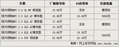北京現(xiàn)代領(lǐng)翔在去年12月份正式上市,這款車定位于高端市場,推出了2.0和2.4兩個排量共六款車型。自上市以來,領(lǐng)翔在價格上一直沒有出現(xiàn)優(yōu)惠,根據(jù)網(wǎng)上車市價格監(jiān)測系統(tǒng)顯示,目前購買這款車可現(xiàn)金優(yōu)惠5000元,具體車型以及價格如下: