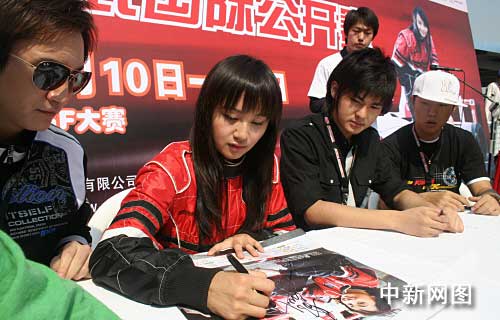 11月11日AGF亞洲方程式國際公開賽珠海站決戰(zhàn)前,AGF第一巾幗車手曹穎與方程式車手在珠海國際賽車場簽贈海報。數(shù)千名車迷、穎迷把現(xiàn)場圍得水泄不通,險些擠垮舞臺。主辦方只好將原定40分鐘的簽名儀式縮短到半小時。